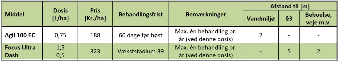 Sprøjtningen udføres bedst som en singlebehandling med kun det aktuelle middel. Såvel Agil 100 EC som Focus Ultra kan blandes med Lamdex, hvis der er behov for bekæmpelse af ådselsbillens larve eller bedeflue.