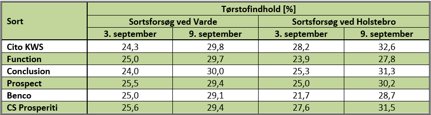 Tabel 1 Tørstofmålinger i sortsforsøgene ved Varde og Holstebro.