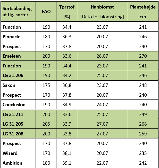 Årets høst af majs er endnu ikke overstået. Det afholder dog ikke grovvareforretningerne fra allerede nu at starte salget af udsæd af majs til kommende forår og meddele, at der er visse sorter, som der er en begrænset mængde af, og "du må hellere slå til nu". Der er flere nye sorter på markedet, som kun har været med i Landsforsøgene i et eller få år. Disse sorter er med i forsøgene igen i år, og resultater foreligger først senere. Vi hører også, at grovvareforretningerne er mere proaktive for at få solgt sortsblandinger i majs. Jeg vil gennemgå de væsentlige aspekter ved sortblandinger, for flere dyrkningsegenskaber som f.eks. kernestørrelse, sygdomsmodtagelighed, plantehøjde, blomstringstidspunkt og FAO-tal, bør være i fokus.