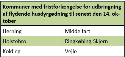 I nedenstående tabel kan du se hvilke kommuner, der er omfattet af den udsatte frist for udbringning af flydende husdyrgødning til senest den 14. oktober.