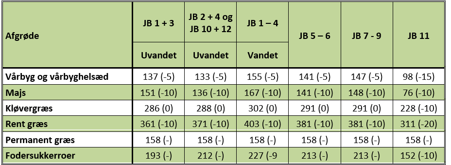 I nedenstående tabel ses dette års kvælstofkvote for de mest gængse afgrøder i et grovfodersædskifte. I parentes er ændringen siden sidste års kvælstofkvote angivet. Reduktionen i kvælstofkvoten for JB 11 er ikke kun reduceret med 5-10 kg N, men nærmere det dobbelte i niveauet 10-20 kg N/ha afhængigt af afgrøden. Den større kvælstofreduktion til afgrøder dyrket på JB 11 sker på baggrund af forsøg. Forsøgene har vist et mindre behov for kvælstof på JB 11, hvorfor dette nu slår igennem i årets kvælstofkvoter. Det er dog ikke alle afgrøder, som er reduceret i kvælstofkvote; for bl.a. kløvergræs, permanent græs og foderroer er kvoten uændret, (hvis vi ser bort fra JB 11).