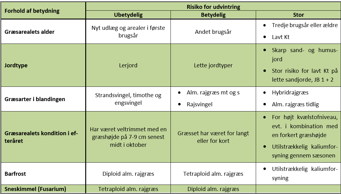 Nedenstående skema, som du kan benytte til risikovurdering for udvintring i græsmarken, er udarbejdet og tilrettet med udgangspunkt i SEGES' anbefalinger.
