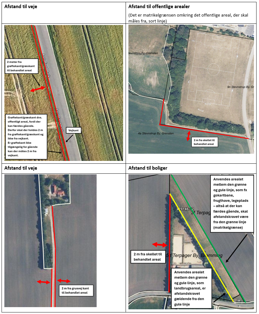 Nedenfor vises der nogle eksempler på, hvad der menes med afstand til veje, boliger, offentlige arealer mv.