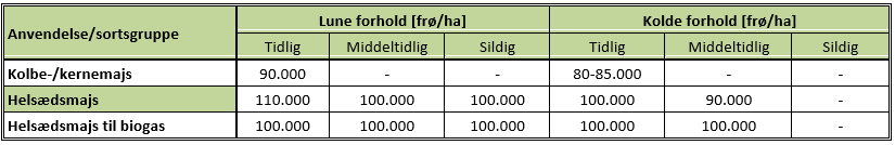 Tabel 1 Frøantal for helsæd-, kolbe- og kernemajs under lune og kolde forhold. (Kilde SEGES, tilpasset af SAGRO)