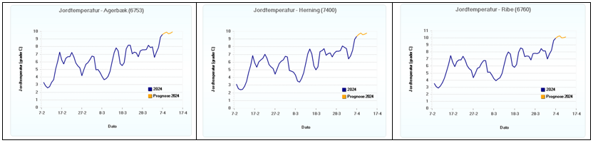 Figur 1 Aktuel jordtemperatur den 7. april og femdøgns-prognose for Agerbæk, Herning og Ribe (Kilde: SEGES)