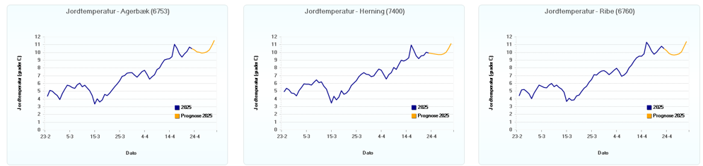Figur 1 Aktuel jordtemperatur den 23. april og femdøgns-prognose for Agerbæk, Herning og Ribe (Kilde: SEGES)