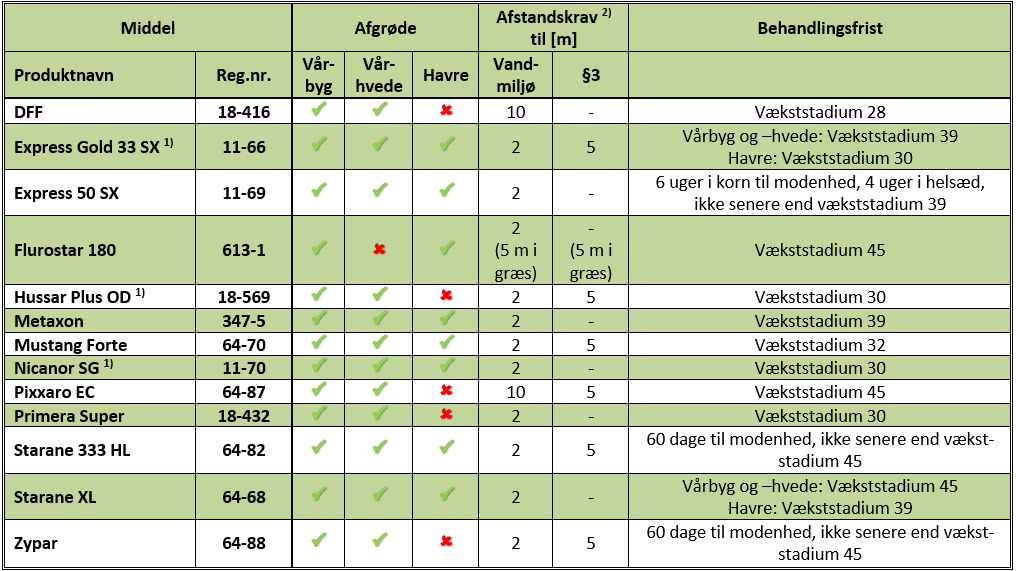 Til ukrudtsbekæmpelse i kornafgrøderne anvendes en blanding af ældre og nyere produkter. Der er ikke kommet nye midler til denne sæson; dog kan der være enkelte nye kopiprodukter/handelsnavne. De fleste midler kan anvendes i alle kornarter, men nogle få er ikke godkendt i vårhvede og havre. I tabel 1 nedenfor ses en oversigt over de mest gængse midlers godkendelse.