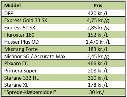 Med udgangspunkt i de godkendte midler, kan der kombineres rigtig mange forskellige løsninger sammen, som alle kan bekæmpe ukrudtet i de fleste marker. Middelvalget er ikke bare et spørgsmål om effekt, men i høj grad også om pris. Imidlertid er sammenligning af priser et uoverskueligt kaos af vejledende (læs "vildledende") priser og detailleddets forskellige rabatordninger. For blot at have en nogenlunde idé om prisniveauet på de viste standard-løsningsforslag har vi anvendt flg. priser, som er hentet i "Middeldatabasen" (opdateret 24.04.2025).