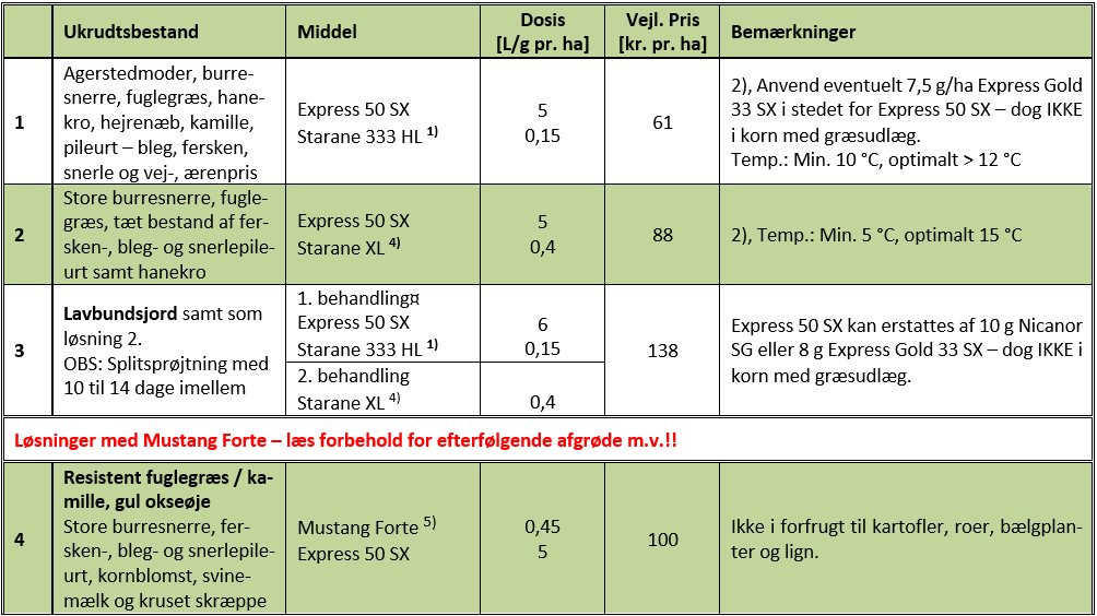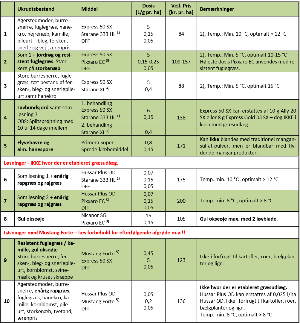 Nedenstående standardløsninger er gældende for kornafgrøder i begyndende buskning fra vækststadium 20, og for ukrudt med 3-4 løvblade. For flere ukrudtsmidler er kun lavere doseringer lovlige før vækststadium 20; dette gælder bl.a for produkterne Pixxaro EC, Starane XL og Starane 333 HL, som anvendes i flere af løsningsforslagene.