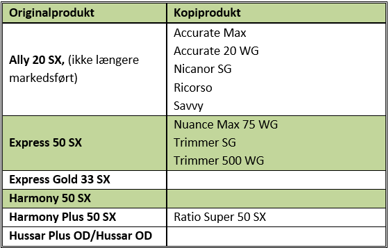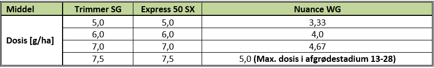 Vi har så vidt muligt lavet vores standardløsningsforslag med originalprodukter, men mange bruger "kopiprodukter", hvilket da også i de fleste tilfælde er helt uproblematisk, da "omsætningsforholdet" mellem produkterne i de fleste tilfælde er 1:1. Dog giver en helt ukritisk udskiftning af Express 50 SX med Nuance Max 75 WG i en del tilfælde problemer med overskridelse af max. tilladt dosis, da det kun er tilladt at anvende op til 5 g/ha Nuance Max 75 WG i kornets vækststadium 13-28. Hvor Express 50 SX indeholder 500 g aktivstof pr. 1.000 g produkt, indeholder Nuance Max 75 WG 750 g aktivstof pr. 1.000 g produkt, så du kan også nøjes med 2/3 af Express 50 SX-dosis. I tabellen nedenfor kan du se omregningen fra Express 50 SX/Trimmer SG til Nuance Max 75 WG.