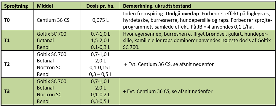 Ukrudtsbekæmpelsen tager udgangspunkt i sprøjteforslagene i tabel 7. Hvor der kun forekommer en "almindelig" ukrudtsbestand uden svært-bekæmpelige arter, kan du få et tilfredsstillende resultat ved at følge nedenstående, men ofte vil der være hårdføre ukrudtsarter, der kræver højere dosis, eller måske driller vejret, så timingen ikke bliver perfekt. I disse tilfælde må tankblanding og timing af sprøjtningerne justeres. Ved sådanne udfordringer må du rådføre dig med din planterådgiver.