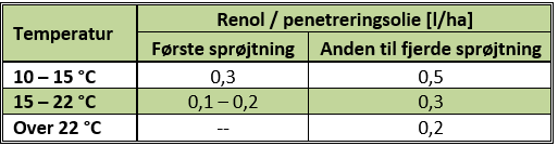 Tabel 8 Retningslinjer for dosering af penetreringsolie afhængig af