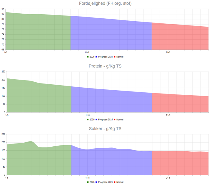 I ingen af markerne viser analyserne, at græsset nærmer sig slæt; FK org. stof er ikke faldet, snarere tvært imod. Sukkerindholdet har også været stigende siden første prøvedato, mens indholdet af råprotein er faldende, som følge af den øgede tørstofmængde.