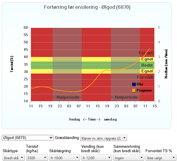 Figur 2 Fortørringsprognosen. Indtastningsfelter og resultat (Kilde SEGES)