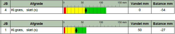Figur 3 viser det aktuelle nedbørsunderskud i to slætgræsmarker på JB1 hhv. en god JB 4. kløvergræsset på JB 1 er allerede vandet med 2 x 25 mm, mens marken med JB 4 er uvandet. Inden for få dage vil vandunderskuddet i begge marker påvirke græssets vækst, og det må overvejes, om der kan vandes igen inden slæt, eller om det er bedre at høste græsset inden produktionen begrænses og mængde og kvalitet påvirkes.
