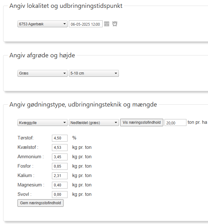Uanset hvilken gylletype, der skal udbringes, bør gødningsværdierne indtastes fra en gylleanalyse, da programmets forvalgte indhold ikke stemmer så godt overens med "vestjysk gylle". Indholdet af tørstof, kvælstof og ammonium er af afgørende betydning for beregning af korrekt markeffekt.