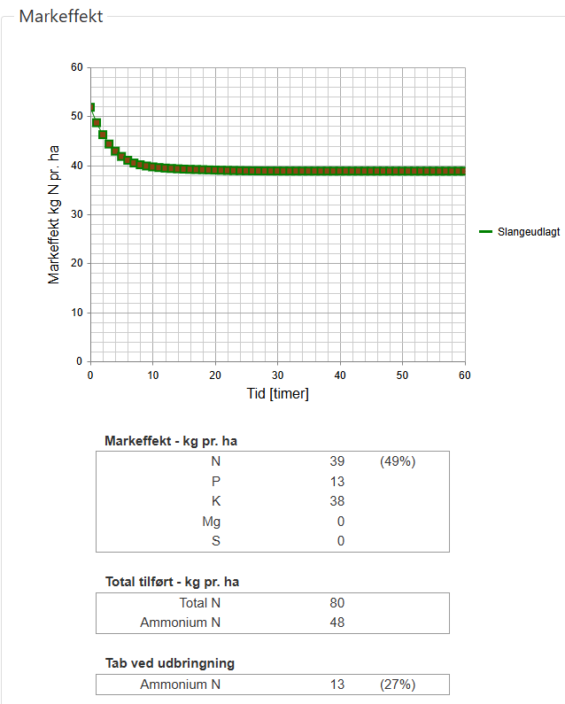 I ovenstående tabel ses, at markeffekten for kvæggylle er højere end for biogasgylle med lavest ammoniumindhold. Hertil er at bemærke, at indholdet i biogasgylle ikke er ens fra anlæg til anlæg i modsætning til kvæggylle, hvor ammoniumindholdet oftest ligger i niveauet 55-60 % af total-kvælstof. Ved lagertanke med opdeling af kvæg- og biogasgylle kan indholdet indtastes, så forskellene i markeffekten på din bedrift bliver synlige ud fra valgte parametre i programmet.