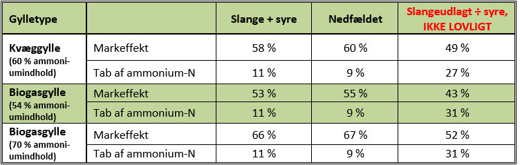 Tabel 2 Eksempler på markeffekt og tab af ammonium ved forskellige gylletyper og udbringningsmetoder i