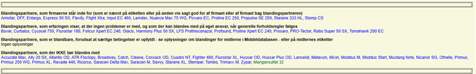 Figur 4 Udklip fra middeldatabasen for Primera Super for hvilke midler der kan blandes med Primera Super og hvilke midler der ikke kan blandes med Primera Super.