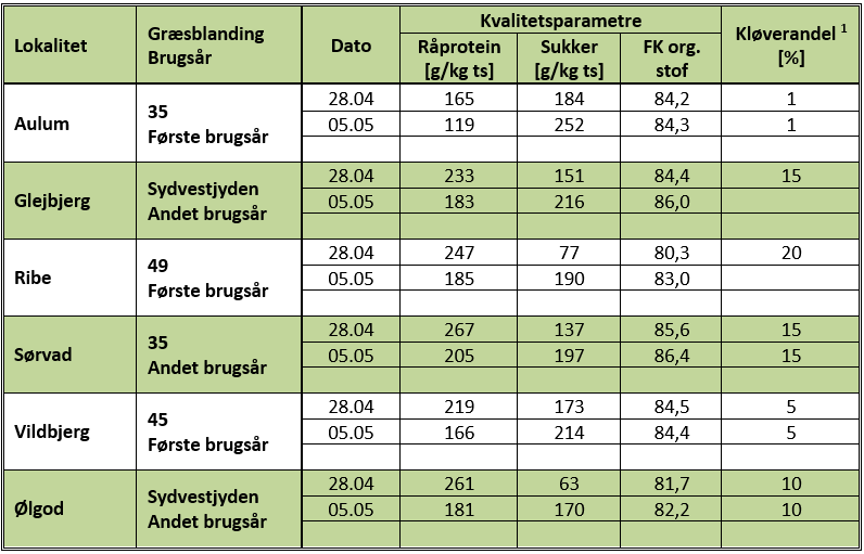 Tabel 1 Friskgræs-prøver 2025. Udvalgte parametre fra udvalgte lokaliteter (Kilde: SEGES)