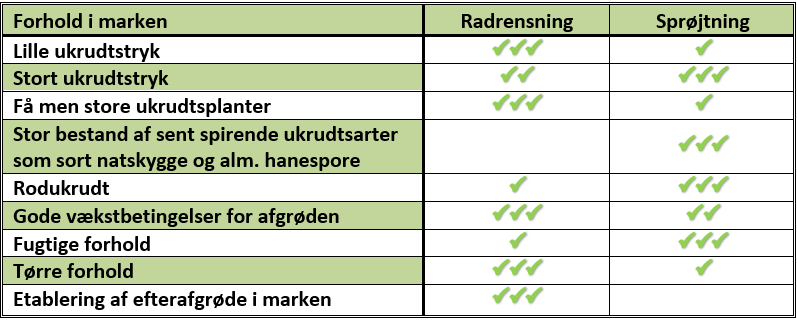 Hvorvidt nyfremspiret eller evt. overlevende ukrudt i marken bedst bekæmpes med kemisk eller mekanisk indsats, kan du finde hjælp til at afgøre i nedenstående tabel, hvor fordele og ulemper ved de to metoder er vægtet.