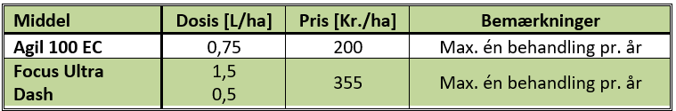 Uanset om der er behov for radrensning eller ej, skal du holde øje med genfremspiring af alm. hanespore på foragre og andre steder, hvor afgrødekonkurrencen kan være lidt mindre. Alm. hanespore bekæmpes effektivt med Agil 100 EC eller Focus Ultra + Dash. Begge midler må kun anvendes én gang pr. vækstsæson.