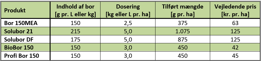 Tabel 3 Vejledende dosis af borprodukter (Kilde: SEGES, Vejledning i planteværn 2025, side 127)