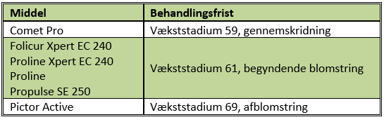 Til den ret sene svampebekæmpelse anvendes ca. 0,3 L/ha Propulse SE 250 + 0,25 L/ha Comet Pro. Comet Pro kan erstattes af 0,2 L/ha Folicur Xpert EC 240/Prosaro/Proline Xpert EC 240/Pictor Active (Agropol tilsættes). Behandlingsfristerne for midlerne ses i tabellen nedenfor.