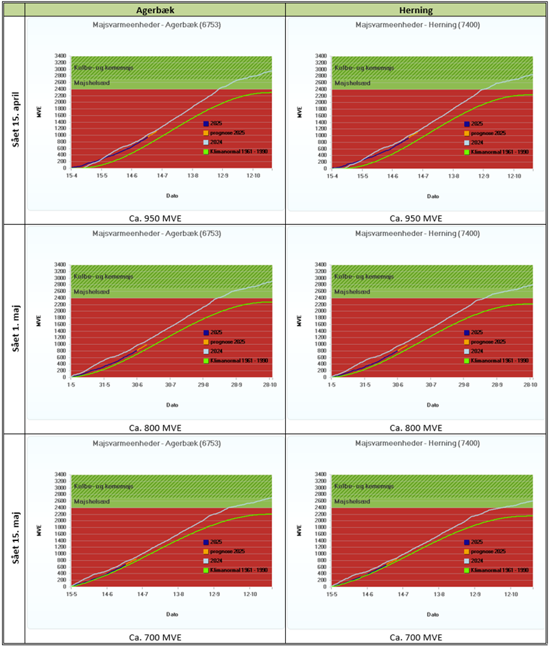 Figur 1 Majsvarmeenheder (MVE) for majs i Agerbæk og Herning, sået 15. april, 1. maj og 15. maj (Kilde: SEGES)