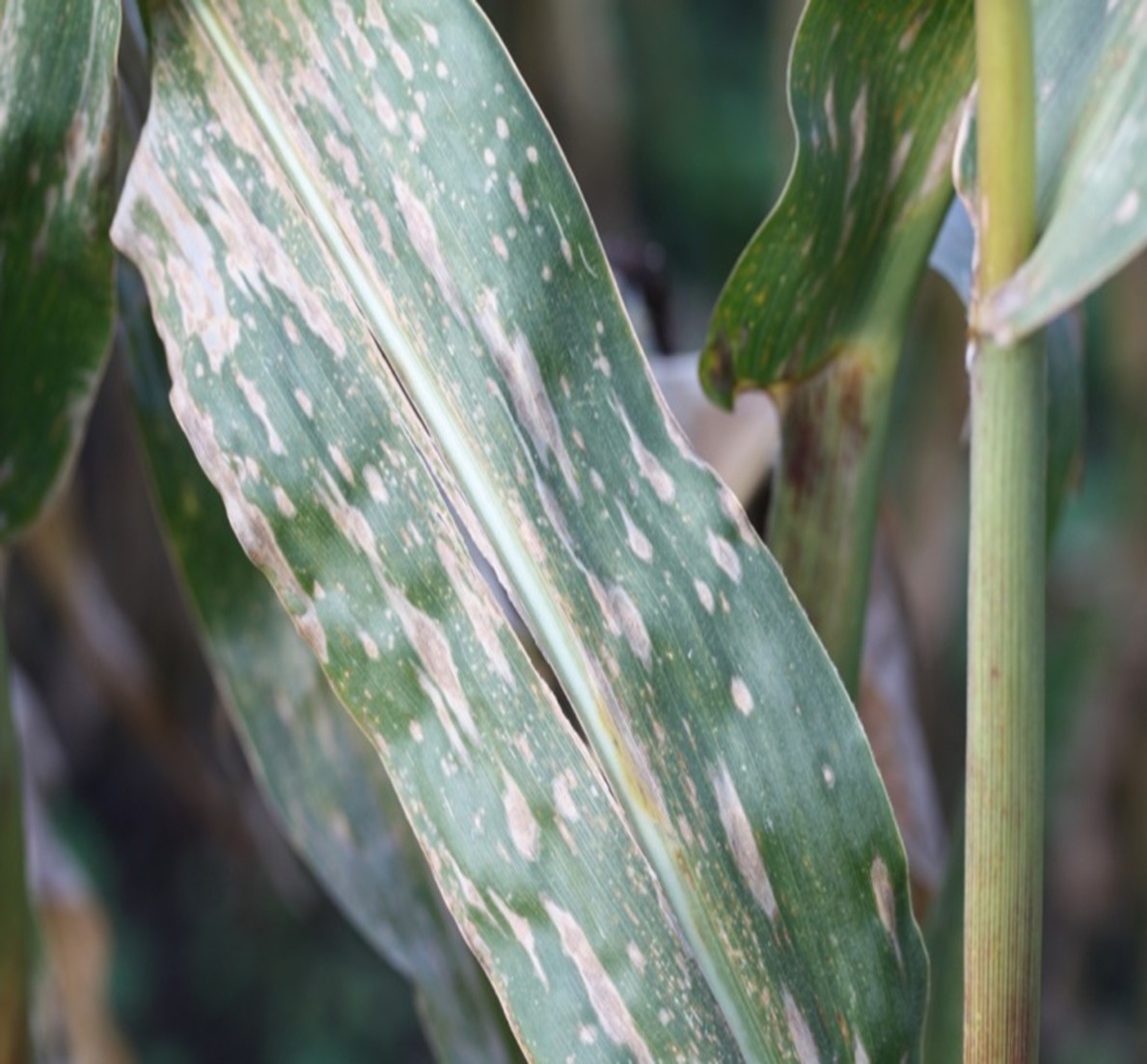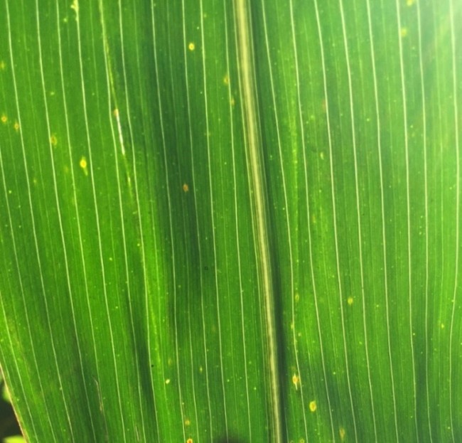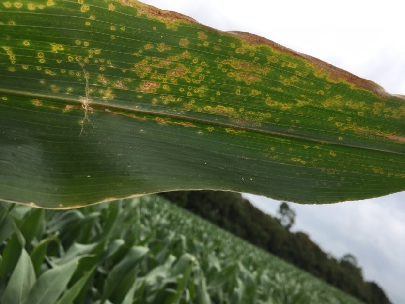 Billede 1 og 2 Majsøjeplet. De talrige små, runde, brune pletter med en gul zone omkring er typiske. Symptomerne er især tydelige, når bladet holdes op mod lyset. Ses ofte på de øverste blade på planten. (Foto: SAGRO)