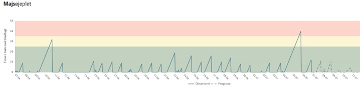 Figur 1 Antal hændelser med bladfugt – og varighed – fra den 1. juni til 7. juli i majsafgrøde ved Ikast. (Kilde: CropManager, SEGES)