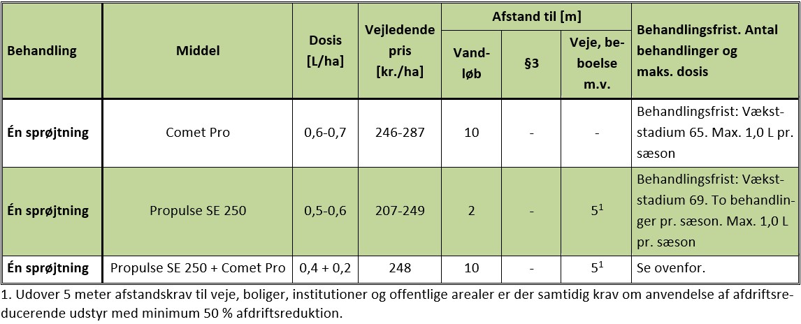 Derfor er det vigtigt, at du løbende kommer rundt i dine marker og får dannet dig et indtryk af udviklingen af bladsvampene. I forhold til bekæmpelsestærskel og middelvalg er der ikke noget nyt, og nedenstående afsnit er derfor i hovedtræk en gengivelse af det, vi har bragt tidligere år. Husk dog at være opmærksom på afstandskravet til veje, boliger og offentlige arealer som er 5 meter for Propulse SE 250 og 2 meter for Comet Pro, hvilket betyder, at hele marken ikke kan behandles, hvis marken ligger tæt op til vejen. Det gælder om at huske dette, både når der sprøjtes, og når sprøjtningen skrives ind i sprøjtejournalen.