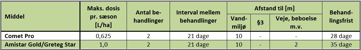 Tabel 3 Godkendelse af Comet Pro og Amistar Gold/Greteg Star i foderroer.