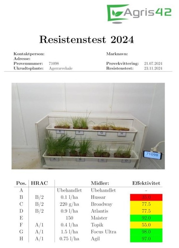 Test af tokimbladede ukrudtsarter og andre græsser end de nævnte kan udføres efter aftale med Agris42. Resistenstest af alm. hanespore udføres forår.