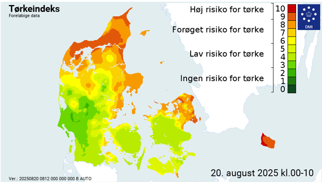 Figur 1 DMI Tørkeindeks den 20. august (Kilde: DMI).