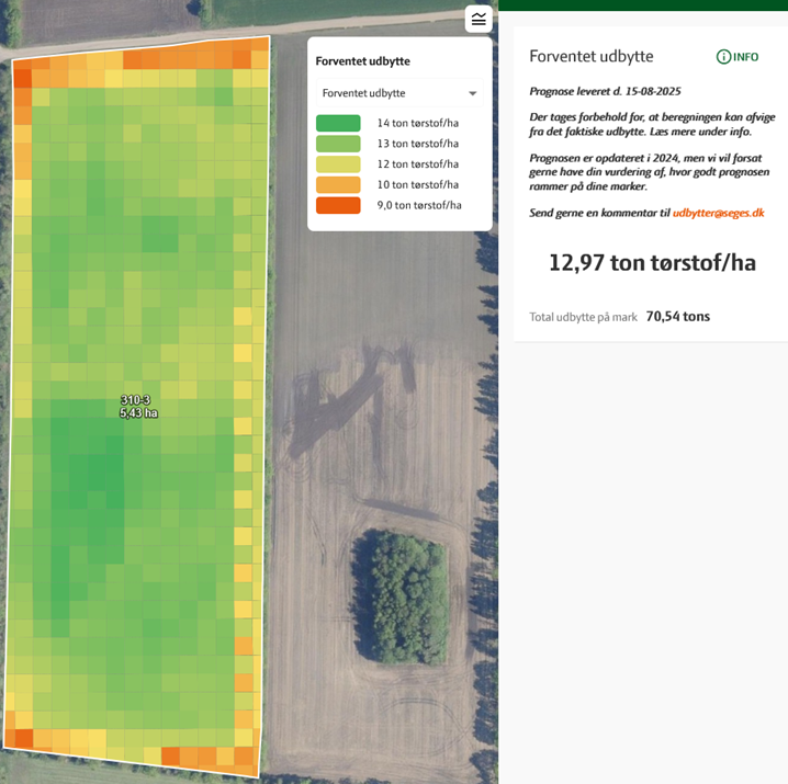 Selvom der er et stykke tid til høst af helsædsmajs, er det allerede nu muligt at få et forsigtigt bud på årets udbytte i majshelsæd. Et af værktøjerne i CropManager er en udbytteprognose for majshelsæd. Ud fra satellitfotos og analyser giver prognosen et bud på, hvad tørstofudbyttet bliver pr. hektar, og hvad det samlede udbytte bliver for hele marken målt i tons tørstof. Da det er en prognose, er det selvfølgelig forbundet med en usikkerhed, som aktuelt angives til +/- 1,3 tons tørstof pr. ha, men som overordnet værktøj giver det et fornuftigt overblik over markens og ejendommens udbyttepotentiale. Derudover er det også meget tydeligt at se forskellene indenfor marken, som ellers kan være svære at få et indtryk af i majsmarken.