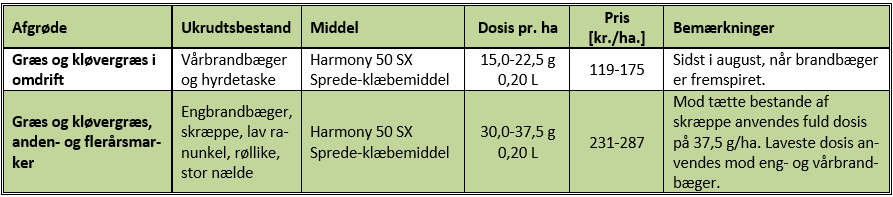 Tabel 1 Anvendelse af Harmony 50 SX i græsmarker.