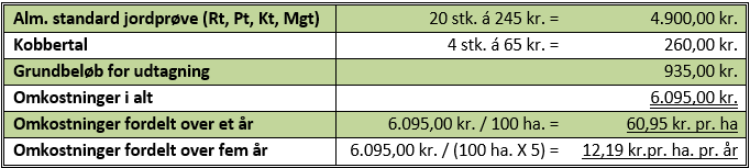 I tabel 2 er omkostningerne i forbindelse med udtagning af jordprøver opgjort for en ejendom på 100 ha.