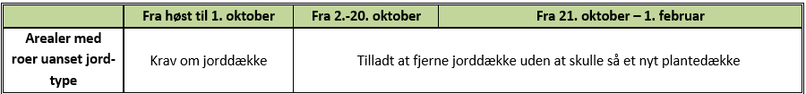 For roer er det dog særligt gældende, at høstes roerne efter den 2. oktober, er der ingen krav om jorddække, mens der ved tidligere høst skal være jorddække. Høstes roerne inden 2. oktober, må jorden ikke jordbearbejdes før efter den 2. oktober pga. reglerne om jorddække, selvom reglerne for dyrkningsrelaterede tiltag har roer som en undtagelse. Der må gerne etableres vintersæd eller andet plantedække efter roer uanset høstdato.