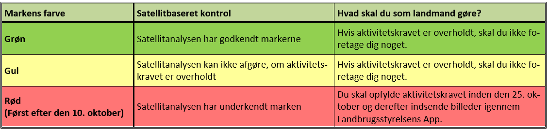 Styrelsen for Grøn Arealomlægning og Vandmiljø's (SGAV) satellitkontrol er efterhånden ved at være kendt af de fleste. Satellitkontrollen startede for nogle år siden med at kontrollere, om aktivitetskravet var overholdt på græsarealer. Sidenhen er kontrollen udvidet og omfatter også kontrol af korrekt anmeldelse af afgrøder, om pløjeforbuddet på diverse bioordninger er overholdt, etablering af efterafgrøder, og hvorvidt aktivitetskravet er overholdt. Som udgangspunkt er det næsten udelukkende græsarealer, som bliver underkendt i denne kontrol. Den satellitbaserede kontrol af aktivitetskravet går også under navnet "trafiklys", og det skyldes, at markerne får en farve afhængig af SGAV's bedømmelse af markerne ud fra en analyse af satellitdata. I nedenstående tabel kan du se, hvad de respektive farver betyder i forhold til opfyldelse af aktivitetskravet.