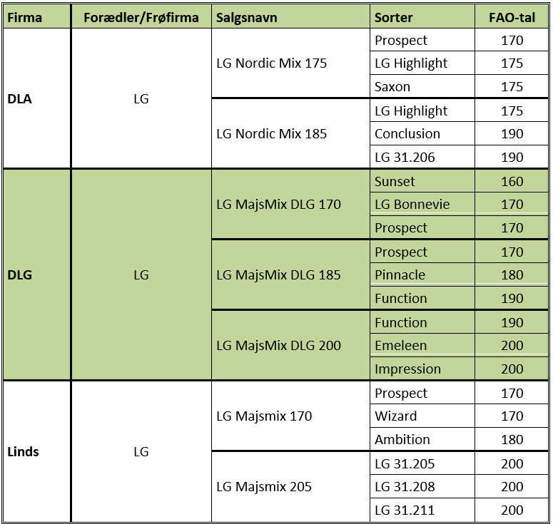 Tabel 2 Oversigt over markedsførte sortsblandinger i majs til sæson 2026.