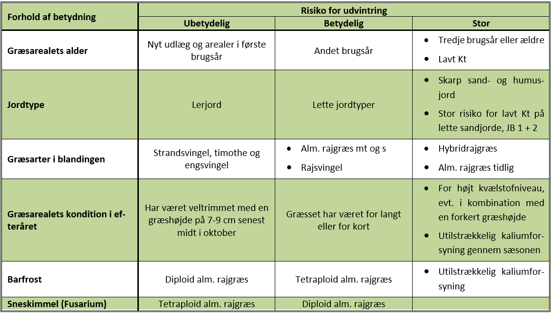 Græsarterne er ikke alle lige vinterfaste. Det er særligt rajgræsserne – især de tidlige sorter, som dog ikke bruges ret meget, samt hybridrajgræs, der risikerer at udvintre, hvis de slættes for sent, mens strandsvingel, timothe, engsvingel og kløver er meget mere robuste.