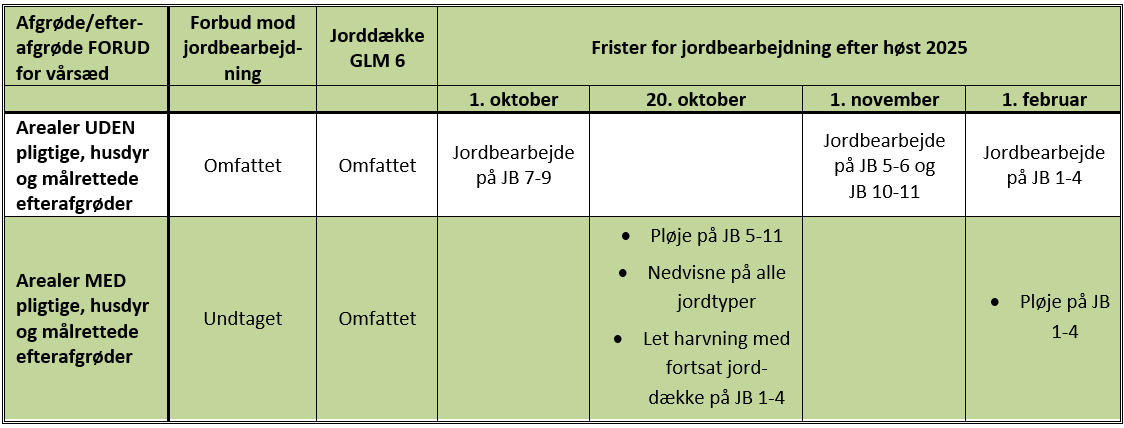 Generelt er der et forbud mod jordbehandling forud for vårsåede eftergrøder i en periode fra høst indtil en dato i efteråret på ler- og humusjorde, JB 5-11, og indtil 1. februar på sandjorde, JB 1-4. Desuden er der også et krav om jorddække, GLM 6, i følsomme perioder i efteråret og vinteren for at undgå jorderosion og mindske udvaskning af næringsstoffer til vandmiljøet. Se tabel 3.