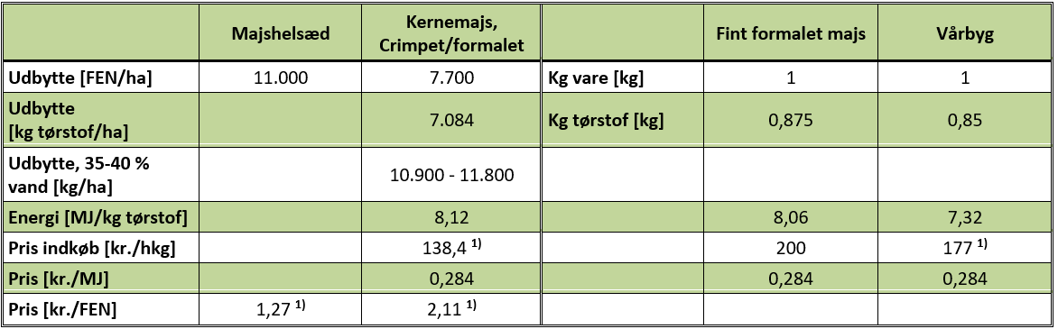 Tabel 1 Oversigt over prisen pr. energienhed ved høst af majshelsæd og crimpet/formalet kernemajs og indkøb af fint formalet majs og vårbyg.