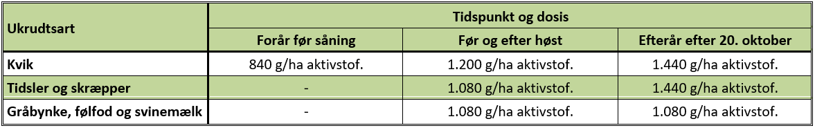 Ved tilstrækkelig nedbør i eftersommeren vil tidsler, gråbynke, svinemælk og følfod få optimale vækstforhold og udvikle blade, de er store nok til, at glyphosat kan transporteres ned i de underjordiske dele. Dette giver en høj bekæmpelseseffekt ved sprøjtning også i begyndelsen af oktober. Gråbynke og følfod er særligt følsomme overfor glyphosat, og den normale dosis på ca. 1.080 g pr. ha er som regel tilstrækkelig. Mod tidsler og skræpper anbefales en højere dosis på ca. 1.440 g pr. ha for at opnå fuld virkning.