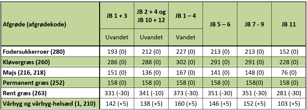I nedenstående tabel ses dette års kvælstofkvoter for de mest gængse afgrøder i et grovfodersædskifte. I parentes er ændringen i forhold til sidste års kvælstofkvote angivet.