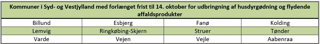 Som omtalt i TILVÆKST Grovfoder nr. 27 er fristen for udbringning af flydende husdyrgødning og flydende affaldsprodukter forlænget til den 14. oktober i en række kommuner. Med opgørelsen af nedbør for uge 38 er listen med kommuner omfattet af fristforlængelsen endelig. Du kan se den fuldstændige liste over kommuner med fristforlængelse på Styrelsen for Grøn Arealomlægning og Vandmiljø's hjemmeside