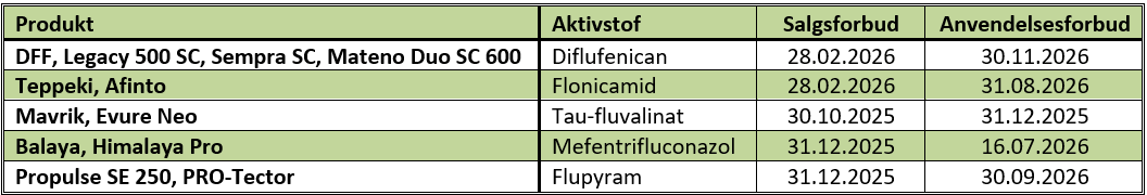 Det er tidligere afgjort, at svampemidler som Balaya og Propulse SE 250 får salgsforbud pr. 32.12.2025 og udfases efter næste dyrkningssæson, og i denne uge kom afgørelsen så vedr. produkter som DFF og Legacy 500 SC, som vi bl.a. bruger mod ærenpris i majs. Disse midler har dog fået salgsforbud pr. 28.02.2026 og anvendelsesforbud pr. 30.11.2026, så du kan nå at indkøbe den mængde, du skal bruge i hele 2026. Du skal dog ikke tage mere hjem, end du kan nå at bruge i 2026, da anvendelsesforbud er lig med opbevaringsforbud og evt. restlagre skal derfor bortskaffes.