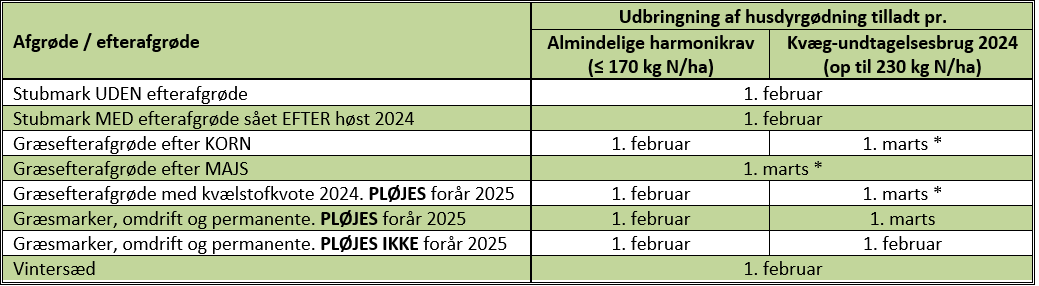 Generelt må fast husdyrgødning ligeledes udbringes fra 1. februar på vintersæd og græsmarker, som skal ligge til produktion i 2025. Endvidere må udbringning ske på stubmarker og græsmarker, som skal lægges om i foråret; her skal nedbringning med plov eller kultiveringsredskaber som tand- og tallerkenharve ske inden fire timer, således at gødningen blandes helt med jord eller vendes ned under jordoverfladen.