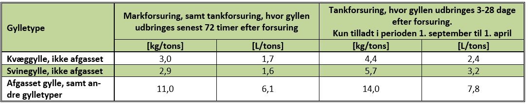 Tabel 4 Krav til mængde 96 % svovlsyre til forsuring af gylle